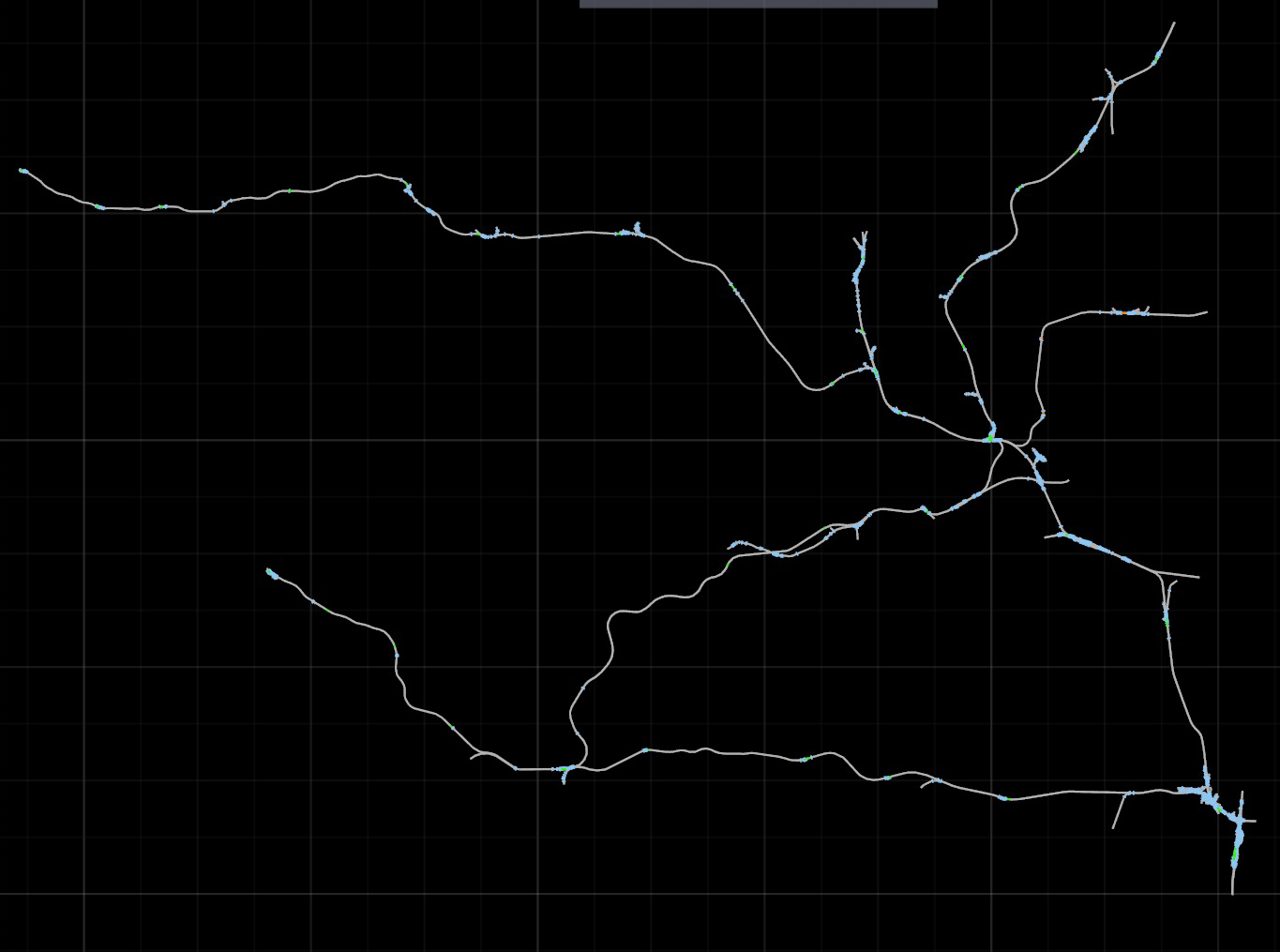 Major track is laid out, several small areas are being worked on. The 3 rivers have water in them. 40 bridges uses so far. Towns have been named.